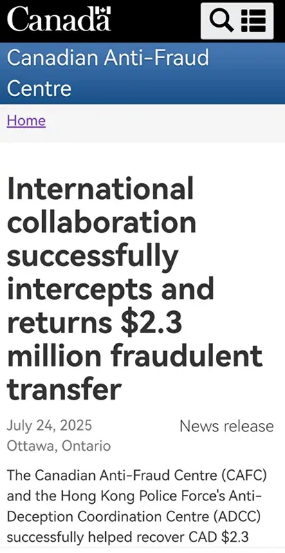 In June 2025, a Canadian law firm in Vancouver fell victim to a Business Email Compromise scam. Fraudsters posed as a regular contact sent fraudulent emails to trick the firm into wiring CAD 2.3 million to a bank account in Hong Kong. After identifying the fraudulent transfer, the bank alerted the Hong Kong Police Force. Thanks to the close cooperation between Chinese and Canadian police forces, the transfer was successfully intercepted and the money recovered finally. As Chris Lynam, Director General of the Canadian Anti-Fraud Centre, said, “This recovery demonstrates the power of global partnerships in the fight against fraud. Through trusted coordination and timely intelligence exchange with our colleagues of the Hong Kong Police Force, we not only helped a Canadian business avoid a significant loss, but also disrupted criminal activity at the international level.”
