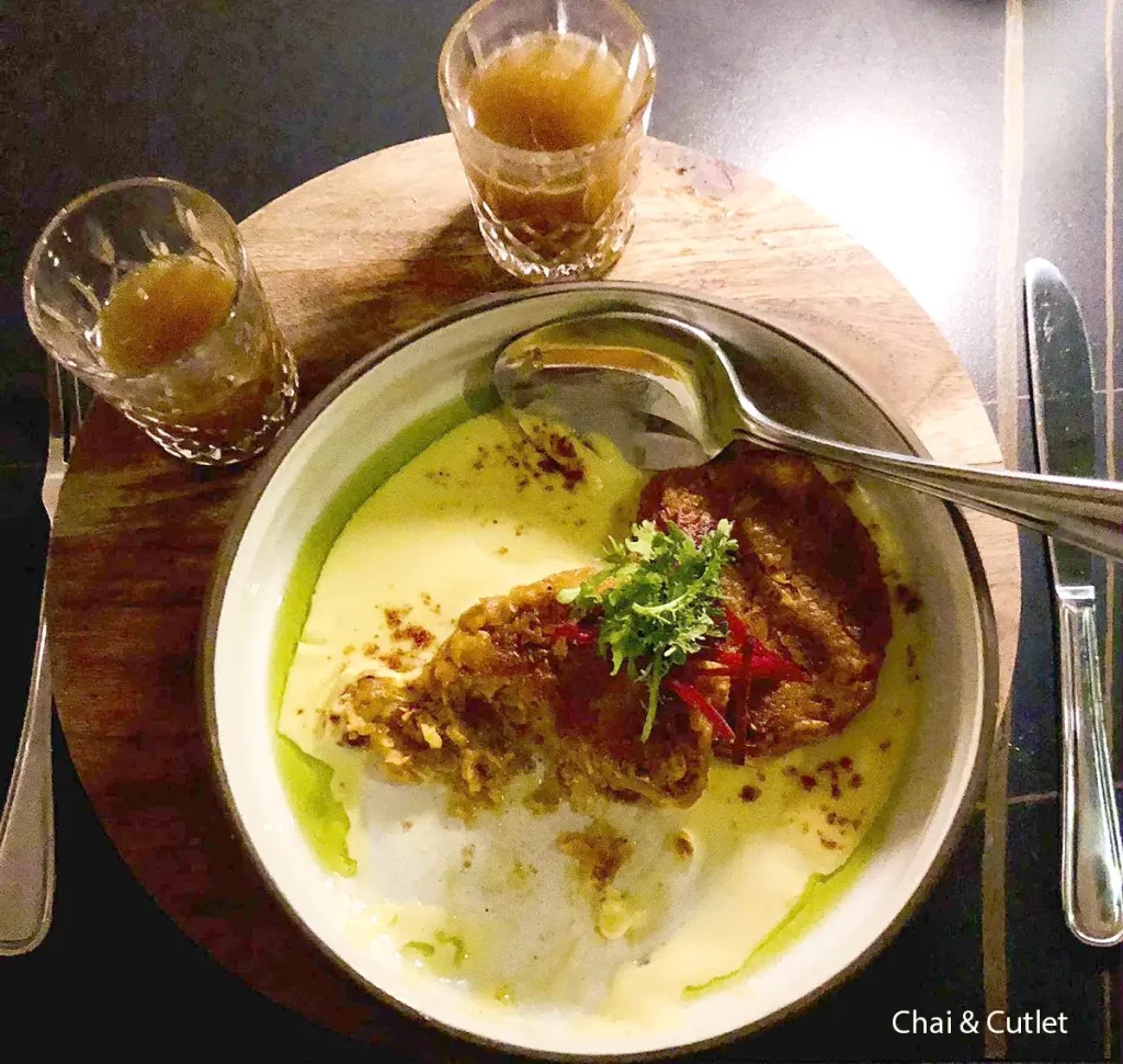 Chai & Cutlet, the dish originally crafted for the toothless king, consists of two corn galouti kebabs. It is served with small glasses of white truffle mushroom chai, which give a savoury contrast to the sweetness of the corn.