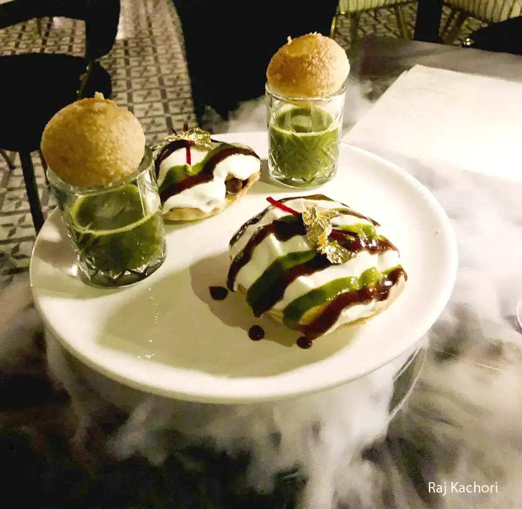 I started with Raj Kachori, a popular appetizer. It’s a crisp tart shell filled with a mixture of potatoes, yogurt, lentils, spices, pomegranate, chutney and morel, served with Paani Puri. Paani Puri are crisp shells that you fill with the vegetables. Edible gold leaf adorns the kachori, which arrived atop a bed of dry ice for a dramatic start to dinner. Glasses of herbal cilantro-mint juice accompanied it and complemented it very well.