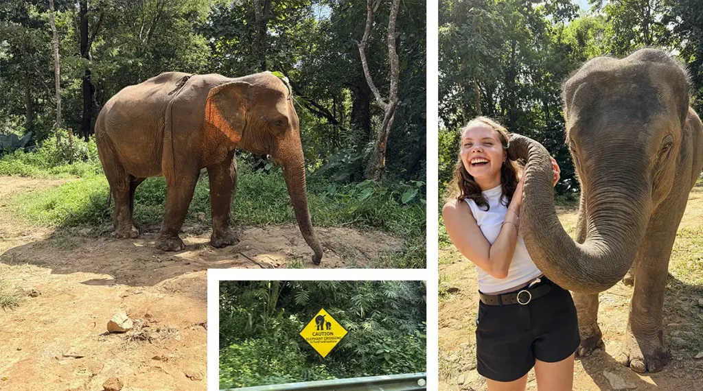 I discovered Éléphants au Naturels years earlier on a bikeride while watching the mahouts (elephant caretakers) and their elephants walk down the road. However, the main hint to the small camp’s existence is the “Elephant Crossing” sign. A little hike down from the rocky parking lot, we found the elephants grazing by a covered shelter. The mahouts kindly offered to take photos of us with the elephants, who greeted us with a gentle hug of their trunks. If you follow the sound of the river, you may even get to see them bathing in a waterfall!