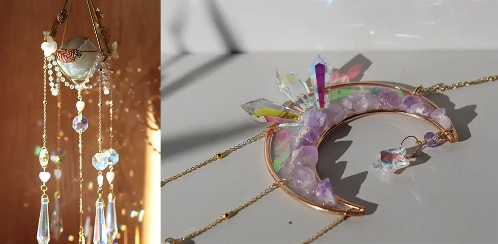 Jasper’s Meridians began during the COVID‑19 pandemic, when Apryl started selling premade suncatchers. She explains, “I chose suncatchers because I wanted to spread something beautiful in a time when many things were ugly during COVID.” A friend encouraged her to try making them herself, and that suggestion sparked the creative journey that would become Jasper’s Meridians. “I went down this new path of creating,” she says. “I had always been very creative, so it wasn’t completely new to make things — but it was a new craft.” Today, her work blends crystals, metals, resin, wire wrapping, and even flower preservation into a signature style that is instantly recognizable.