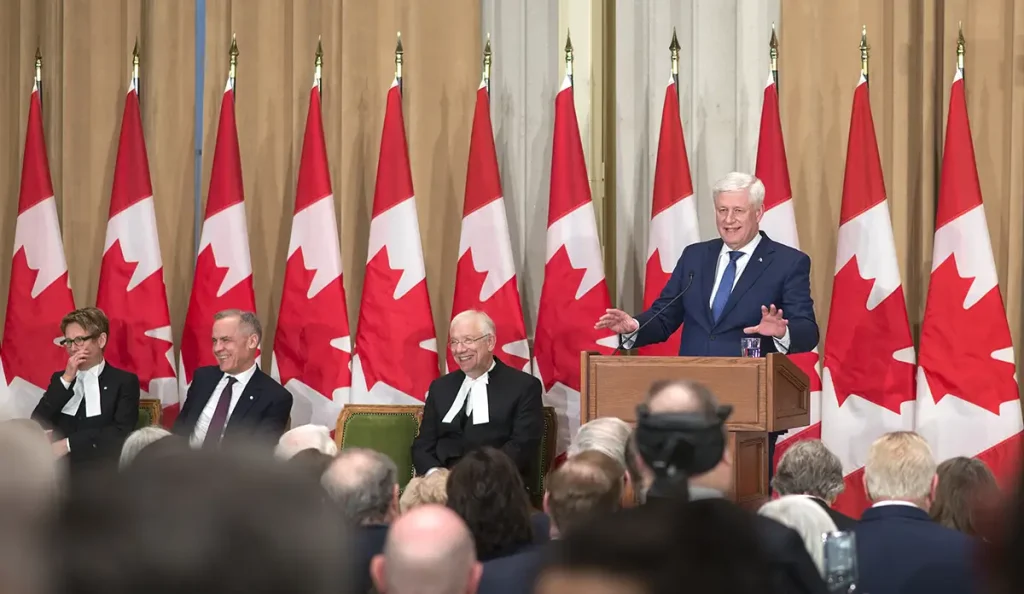 Header image: Prime Minister Carney gazes at the portrait of the Right Honourable Stephen Harper, the 22nd prime minister of Canada, while a crowd of dignitaries looks on.