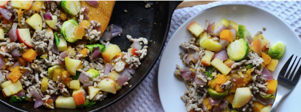 All these foods can be combined or cooked separately throughout the fall and at Thanksgiving. This turkey, apple breakfast hash recipe does just that, and by doubling up on the quantities you will have a ready made ‘left-over’ meal for either lunch or dinner. You can always add some mashed or roasted potatoes as an extra side. I find that by having certain meals ready it makes Thanksgiving so much more enjoyable and relaxing. You can always substitute butternut squash for pumpkin or swap out the turkey for chicken or beef. This is a great breakfast to have before heading out for a fall hike.