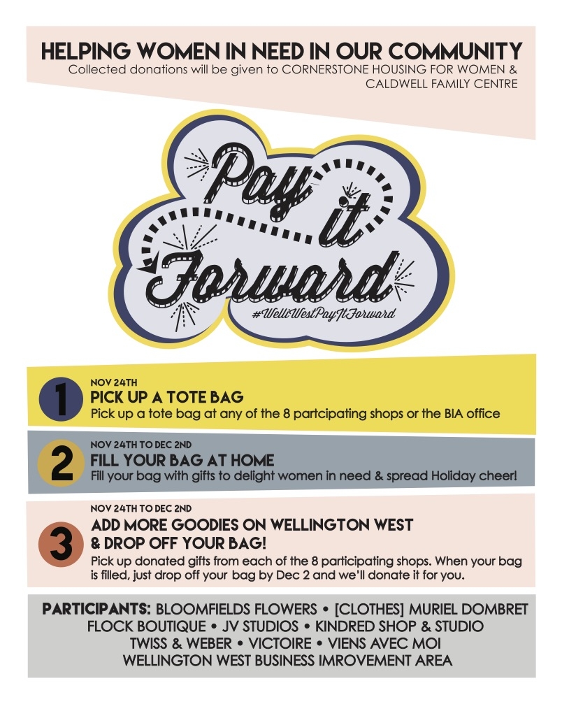 The boutiques of Wellington West (Victoire, Viens Avec Moi, Twiss & Weber, Flock, JV Studios, Kindred, Clothes by Muriel Dombret, Bloomfields Flowers and the Wellington West BIA) are teaming up for a “Pay It Forward” campaign, a charity initiative the collective of female business owners created to support local women in need and give back around the holidays. Tote bags will be available at each of the participating shops for customers to grab and fill with the donated items at from each boutique, as well as any additional small gifts or donations they would like to give. Filled bags can be dropped off at any of the shops on or before December 2nd. Each boutique will also be making bulk donations to the Caldwell Family Centre and Cornerstone Housing for Women.