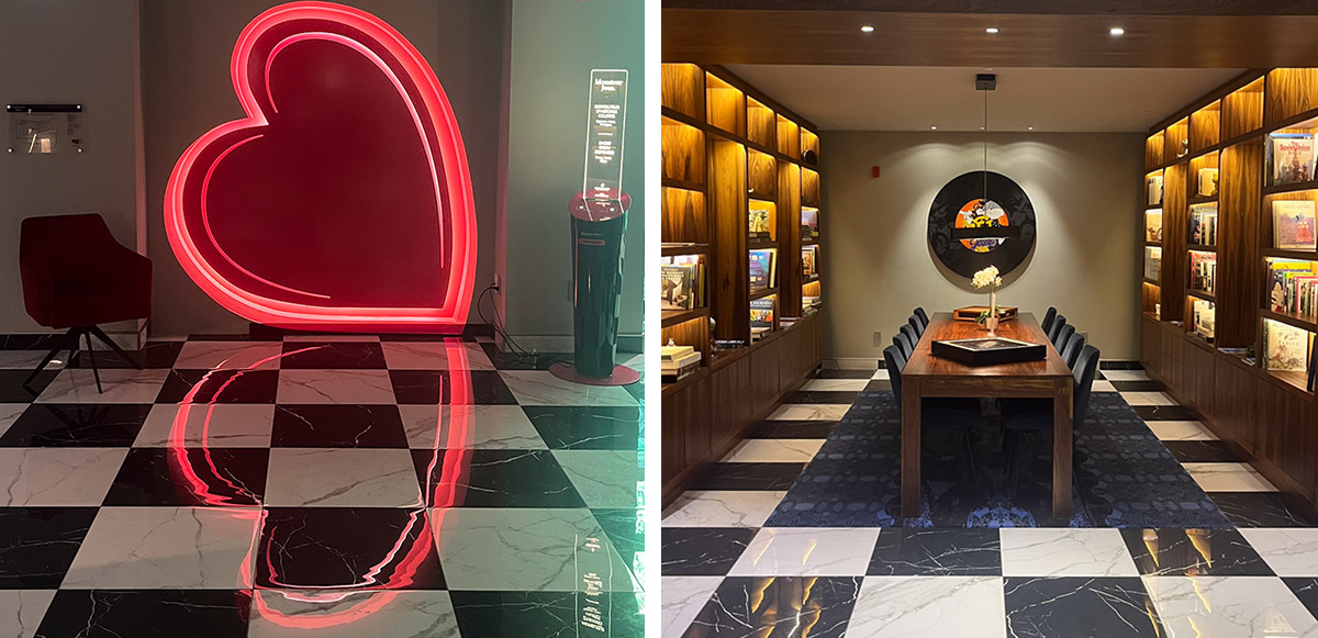One of the defining features that sets Monsieur Jean apart from other hotels is the robust art collection throughout the property. In the lobby, guests are greeted by a glowing heart sculpture and an interactive machine printing original short stories on command. Upon exiting the elevator on each floor, we were enshrouded by little starlights on the ceiling, illuminating the dim hallways. Eclectic paintings in front of the elevator reveal the theme of each floor, with selections from around the world showcasing dancing, balloons and more. This creative style is replicated in each bedroom, with a tiger patch adorning striped chairs and rubber ducks on nightstands. Whether it be a black and white painting of a man floating away on a pink balloon or an ostrich/plant cyborg admiring the Mona Lisa, each piece of artwork is equally as eye-catching as the next.