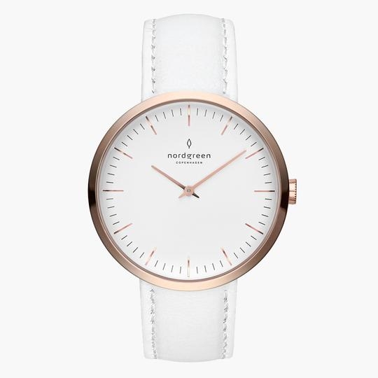The men’s Pioneer is Nordgreen's flagship watch, with a minimalist dial that comes in black, white, or navy blue. This watch is synonymous with simple-living and the sustainable environment in Denmark that the partners want to see adopted all over the world. The Pioneer has a third-hand stopwatch for greater accuracy and a chronograph second hand topped with red tips that harkens back to the red tips found on the wind turbines off the shores of Denmark. Choose from the vintage-looking case colours of gunmetal, silver, or rose gold on this 40mm-only watch that comes with vintage-looking straps to match the watch case.