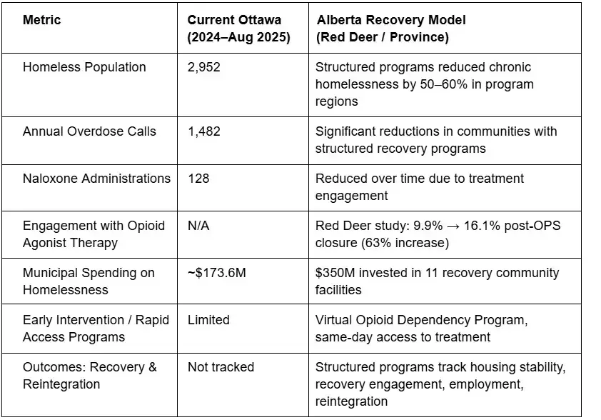 Sources: Ottawa Police Service, 2024–2025; Alberta Recovery Model data; Red Deer OPS closure study, Addiction, 2025.