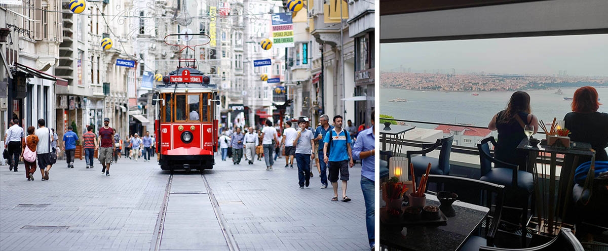 ABOVE: Tourist and locals alike head to Istiklal Street (which means “Independence Avenue”) in the heart of Istanbul for its shops, restaurants, cafes, street shows and more. (PHOTO: Turkiye Tourism) (RIGHT) View from the historic Liman Restaurant in the Galataport.