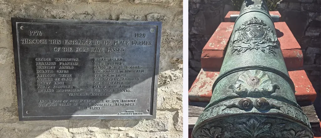 ABOVE: A plaque at the entrance to Fort Ticonderoga lists the famous names from history that walk across the threshold into the fort. (RIGHT) A canon at Fort Ticonderoga bears the French coat of arms, fleurs de lis embellishments and the whimsical snails from Medieval knights’ lore.