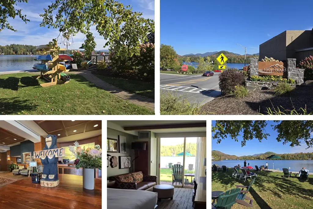 ABOVE (CLOCKWISE): High Peaks Resort’s Lakeside Pool and watercraft that available for guest use. Across the street, the High Peaks Resort hotel main entrance with a view of Mirror Lake. The hotel’s Lakeside open directly onto a green space with access to the water. The High Peaks Resort hotel’s main lobby has an inviting Adirondack vibe.