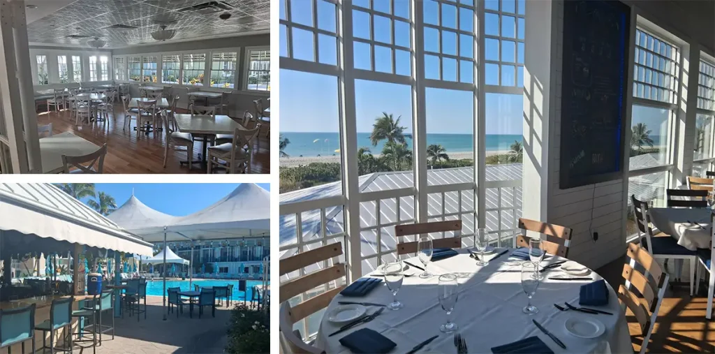 ABOVE: (CLOCKWISE) The original Old Captiva House restaurant offers a historic Florida feel. The second-floor Crow’s Nest Steakhouse has postcard-worthy views of the Gulf of Mexico. The pool and bar is a laid-back spot to get a drink or a bite to eat.