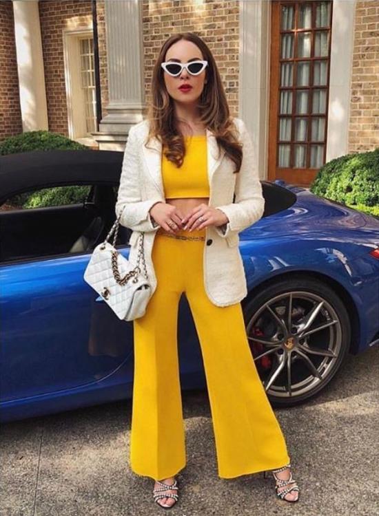 Elite heiress Fallon (Elizabeth Gillies) takes bold color to a new level with a matching yellow two-piece. Though this look may not reflect Canadian winters, we can pull a couple of trends from this outfit. Firstly, bold colors represented through the 80’s are trending right now. The bright yellow is daring and refreshing, especially for professional attire. Pairing it with a textured blazer adds elegance to the outfit. Lastly, the accessories jazz up an otherwise basic two-piece and clearly reflect the trends shifting from summer into fall.