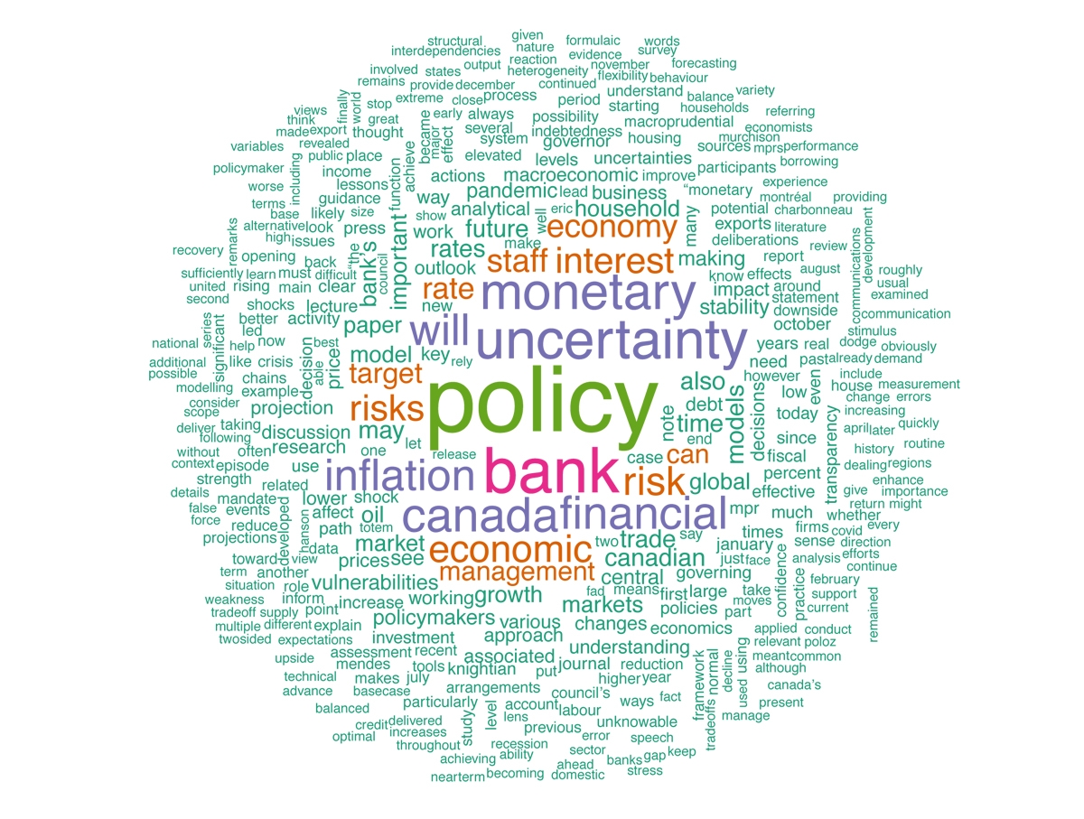 As the word cloud below from April 2020 illustrates, Mr. Poloz focused on the traditional domains of central bankers such as inflation, demand in the economy, financial measures and business confidence. In exercising the Bank’s mandate to conduct monetary policy and promote the stability of the Canadian financial system, Poloz sought to protect the integrity of the Canadian currency, and ensuring liquidity in the commercial banking system. But in transitioning the Bank from a guardian of the currency, and the money supply to become more and more engaged in the specifics of the broader policy debate on the future direction of the economy, Mr. Macklem has vastly expanded the Bank’s repertoire.