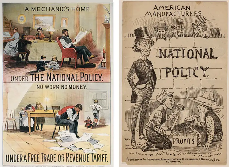 ABOVE: A poster extolling the National Policy. RIGHT: An editorial cartoon on the 1880s version of Canada Strong.