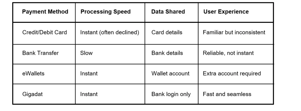Digital-first players increasingly see cards as an outdated solution for high-frequency online payments. Gigadat avoids these problems by operating entirely within trusted banking frameworks.