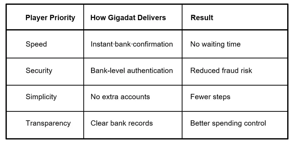 One of Gigadat’s strongest advantages is psychological rather than technical. Players trust what they recognize. Logging into a familiar online banking portal feels safer than entering card numbers or registering new payment accounts.
